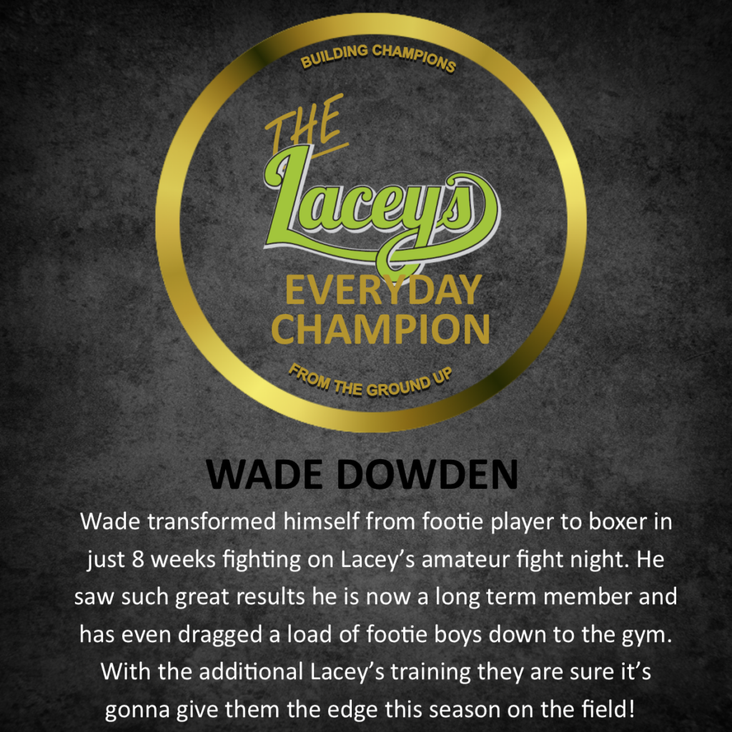 WADE IS A TRUE EXAMPLE OF A LACEYS EVERYDAY CHAMPIONS; BRAVELY THROWING HIMSELF IN AT IN DEEP END HAVING HIS FIRST AMATEUR FIGHT AFTER JUST 8 WEEKS OF TRAINING. HE IS NOW HITTING LACEYS HARD IN A VARIETY OF CLASSES GETTING THE BEST RESULTS HE HAS EVER SEEN!
