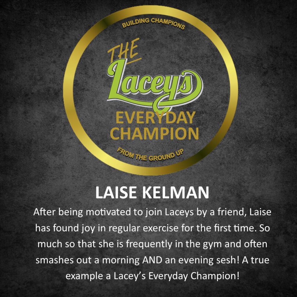 LAISE JOINED LACEY’S A LITTLE UNDER A YEAR AGO AND IN THIS TIME HAS BECOME A BIG PART OF THE LACEY’S CURRAMBINE FAMILY. TAKING PART IN VARIETY OF DIFFERENT CLASSES AND COMPETING IN THE LACEY’S MYZONE CHALLENGES, HER WORK RATE IS UNBELIEVABLE AND SHEPROVING HERSELF TO BE ONE OF THE MOST MOTIVATED MEMBERS IN THE GYM! KEEP UP THE GREAT WORK LAISE!